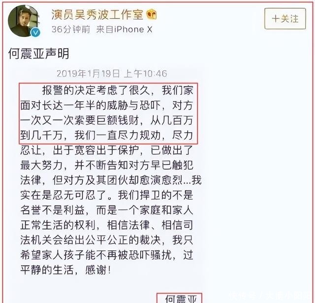 这种先谈和再报警的操作,立即引发了舆论的强烈反弹,后来吴秀波妻子何震亚又发表了声明,称家人长期遭受威胁恐吓,索要金额从数百万暴涨至数千万。