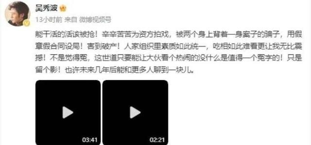 虽然吴秀波一直则坚称自己是受害者,在社交媒体上发声,辛辛苦苦为资方拍戏,被两个身上背着一身案子的骗子,用假章假合同设局,害到破产!